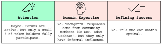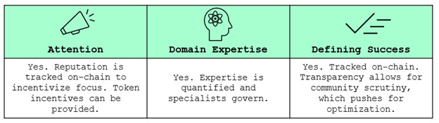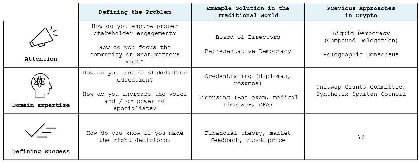 The solution needs to a) intelligently manage stakeholder attention, b) optimize for domain expertise, and c) create feedback loops for constant improvement. All this needs to be done while maintaining decentralization to ensure resilience and minimize corruption.