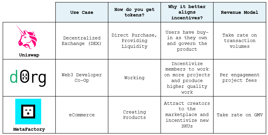 Because the release of tokens can be managed entirely by code, DAOs can create flexible token distribution schemes. This allows projects across a variety of use cases to improve incentive alignment as they optimize for certain business metrics (ie revenue). A few examples below: