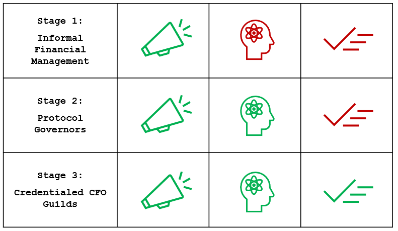 Stage 3: Credentialed CFO Guilds. Reputation of financial governors turns from informal to formal. This could take several forms. DAO members could start evaluating performance of their financial governors through votes, creating an on-chain approval rating. Independent collectives could form as public goods to audit a governor’s track record. Financial governors could begin earning badges signaling their education (ie online courses, rabbithole.gg-like financial training, etc.) and experience levels (ie earning a Compound financial planning badge or a MakerDAO acquisitions badge). The quality of financial governors becomes transparent and quantifiable. Governors can inbound ideas to a protocol as an activist investor would propose a strategic financial shift to a public company, and the DAO votes based on the governor’s track record. Alternatively, marketplaces could form for protocols to recruit financial governors. An on-chain reputational data visualizer forms, resulting in a decentralized LinkedIn of sorts.