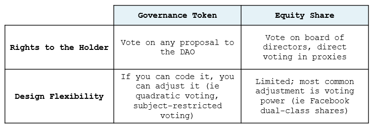 The mechanism for governing DAOs is a governance token. Let’s compare a governance token to a traditional share in a C-Corp: