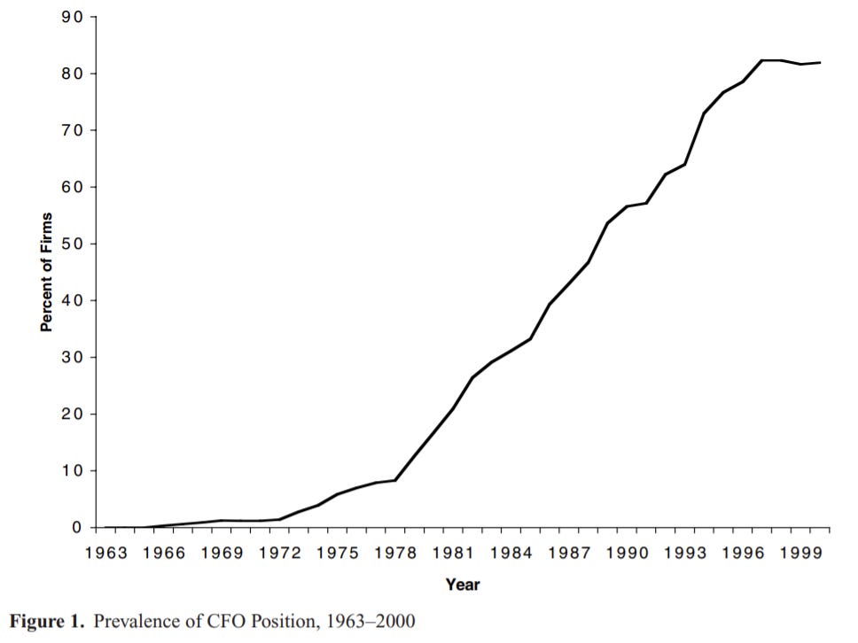 CFOs are a relatively recent creation. Up until the 1970s, financial governance was largely limited to bookkeeping. Then came regulation. In 1976, the SEC issued a mandate requiring increased reporting for large public companies. Increased visibility drove financial scrutiny. Markets realized that optimized financial planning (ie managing cost of capital and allocating capital towards highest ROI opportunities) could help a business grow faster and more efficiently than competitors. Thus, the modern CFO was born.